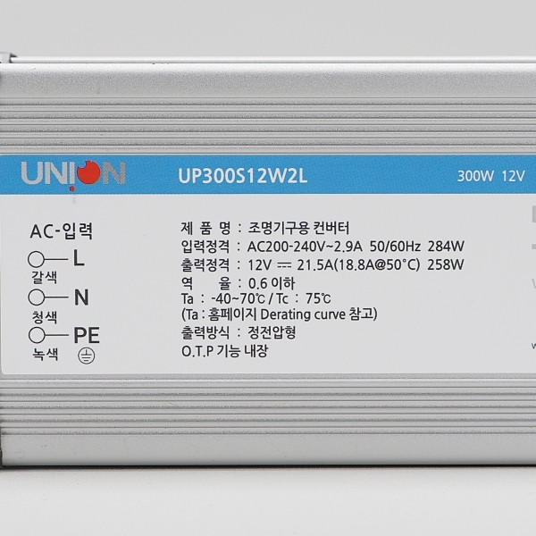 Bộ nguồn DC ổn định 12 V, công suất 360 W (25 A × 12 V), model UP300S12W2L đến từ Union Elecom (Hàn Quốc), đạt chuẩn chống nước IP68 – lý tưởng cho hệ thống chiếu sáng LED ngoài trời hoặc khu vực ẩm ướt